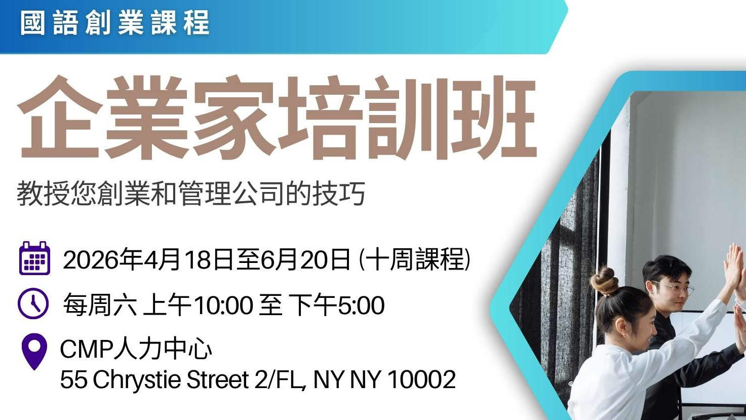 为支持社区创业者及小企业的发展,CMP人力中心属下的商业辅助中心将于4月18日举办为期十周的“企业家培训班”。本次培训班由纽约州经济发展局(Empire State Development)赞助,为学员提供系统性培训课程,旨在帮助学员从零开始了解创业流程,并掌握经营企业所需的关键知识与技能。 本次课程内容涵盖多个创业核心领域,包括公司设立与运营、商业法律与税务、市场推广与营销、商业规划与管理、小型商业贷款与融资,以及创业资源与商业策略,全面协助学员建立稳固的创业基础。 培训班将由多位来自不同专业领域的讲师授课,并结合案例分析与互动讨论,协助学员将理论知识实际应用于创业规划之中,提升实务操作能力。此外,课程期间学员亦可获得一对一商业咨询服务,与专业商业顾问深入探讨个人创业构想、商业模式及市场策略,从而进一步完善创业计划,提升创业成功的机会。 企业家培训班将于4月18日至6月20日举行,每周六上午10时至下午5时,共十周。课程全程以国语授课。上课地点位于CMP人力中心办公室:55 Chrystie Street, 2nd Floor, New York, NY 10002。名额有限,欢迎有意创业人士及小企业主尽早报名参加。 如需了解更多课程资讯或报名方式,请联系人力中心:电话 (646) 410-3394 或 (646) 603-7172;电邮judyzhang@cmpny.org 或 janicezhu@cmpny.org 。