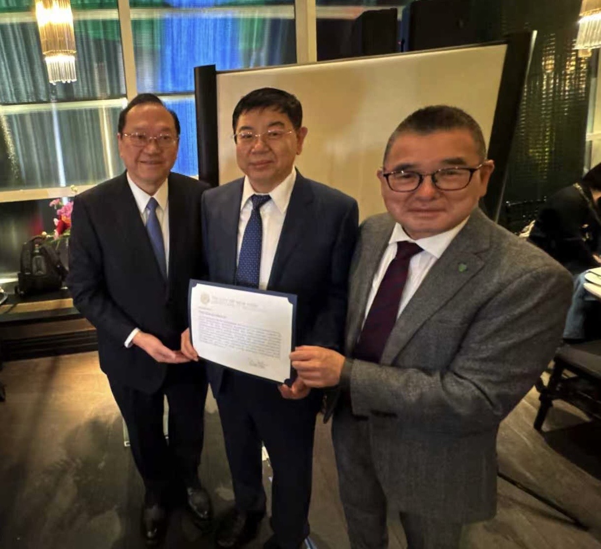 中国驻纽约总领馆领侨处副主任李德领事也应邀致辞。纽约市政府社区事务主管顾雅明代表市长亚当斯向汾酒访问团颁发了贺状。黄华清也代表市议员马泰向访问团颁奖。