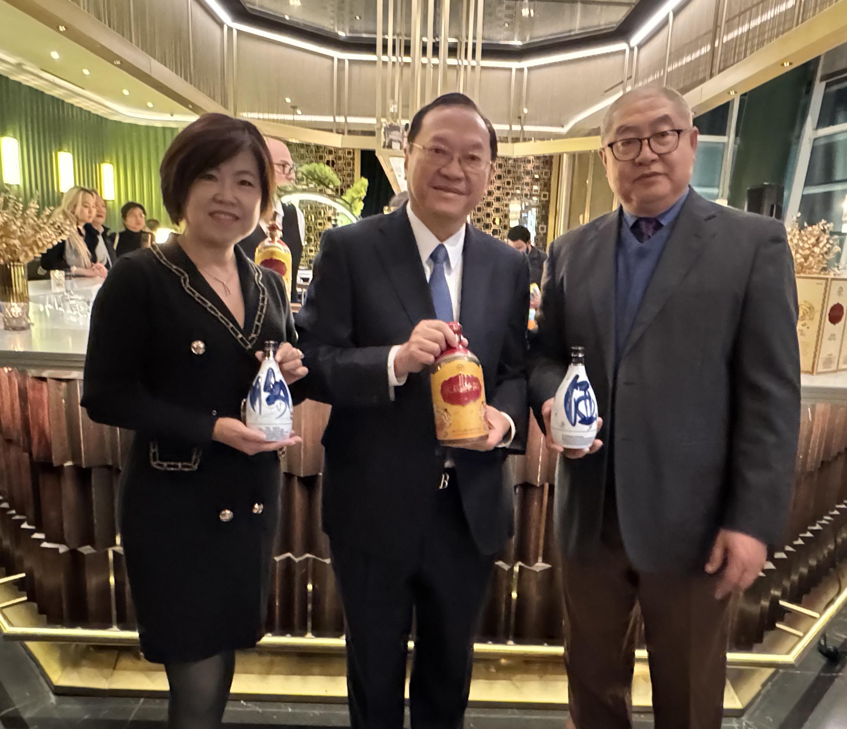 近日,来自山西汾阳的杏花村汾酒集团主管团队日前访问纽约,出席一系列中美酒文化交流活动,庆祝汾酒获得1915年在旧金山举行的巴拿马万国博览会(Panama–Pacific International Exposition)金奖110周年。全美总代理进口经销商-大文行酒业集团有限公司在位于曼哈顿的“胡同中餐厅”举行欢迎晚宴,近百位社区名流、商界翘楚到现场热烈欢迎来自山西汾酒集团董事长袁清茂、副总经理张勇踊、董事长、总经理相里宝宝等一行。