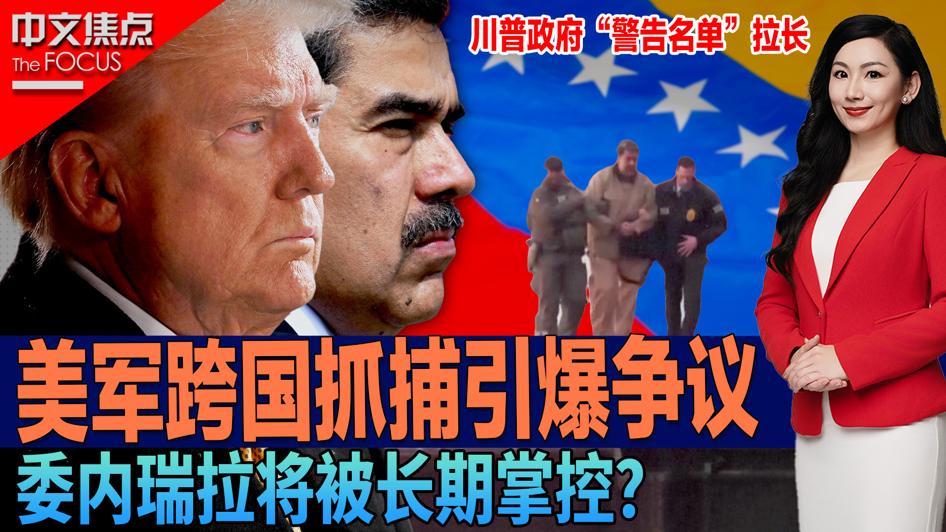 美国跨国抓捕引爆争议 委内瑞拉将被长期掌控?;马杜罗纽约受审不认罪 抓捕是司法正义 还是越权出手?美国内反应两极 国际争论不断;川普政府“警告名单”拉长 委内瑞拉只是开始?《中文焦点》1/8/2026
