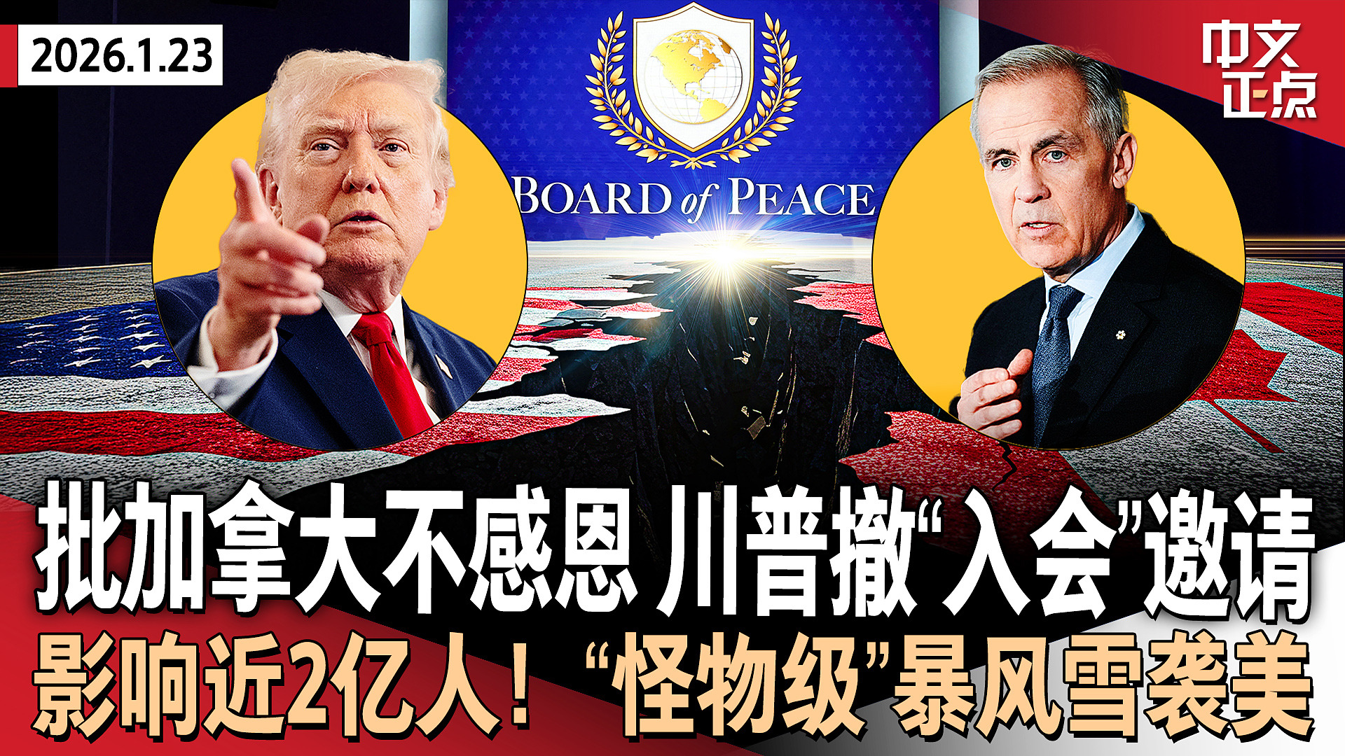 批加拿大不知感激 川普撤回对卡尼和平委员会邀请|川普公开质疑北约盟友忠诚度 英首相罕见谴责|“怪物级”风暴来袭 影响近2亿人 全美十多州宣布紧急状态|美俄乌三方会谈阿联酋登场《中文正点》26.1.23