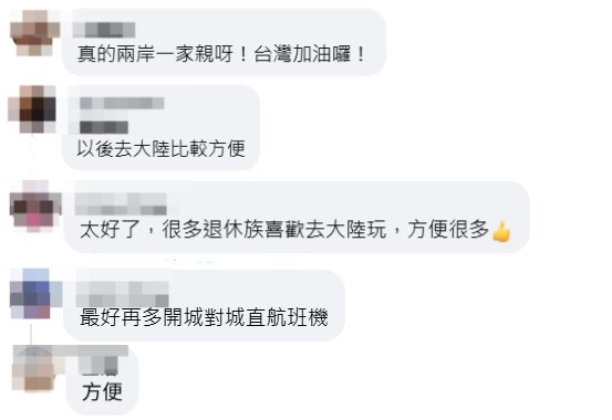 消息一出,便获得台湾舆论的高度关注。许多台湾网友高喊“两岸一家亲”,表示以后去大陆更方便了,还有人希望未来能开通更多直航班机……