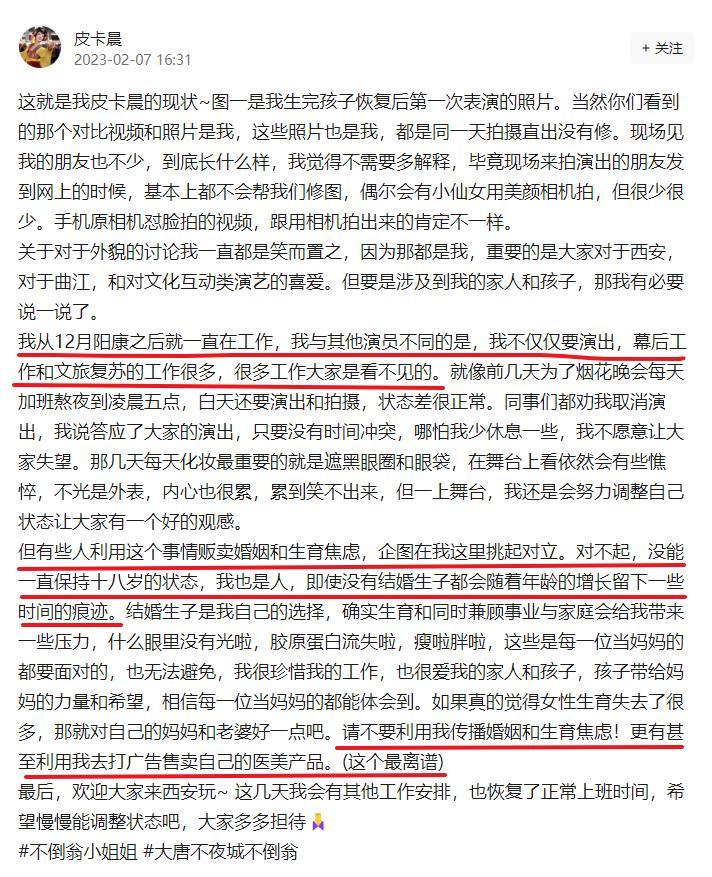 同年2月7日,皮卡晨在社交平台上发布了自己的近照,并对“生娃后面容憔悴”的说法作出回应。