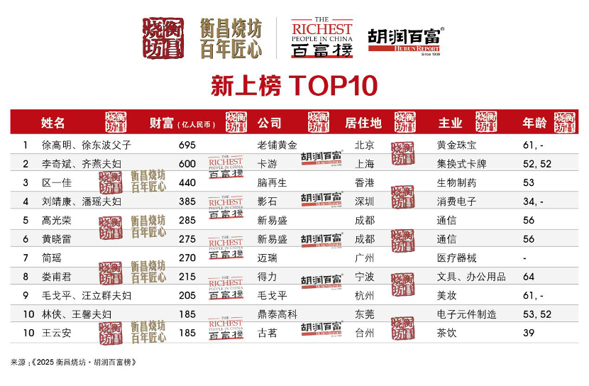 新人之首是老铺黄金的徐高明、徐东波父子,以¥695亿元财富跻身前100;其次是集换式卡牌龙头卡游的李奇斌、齐燕夫妇,财富¥600亿元。新人前十还包括智能影像设备企业影石34岁的刘靖康与其妻子潘瑶,财富¥385亿元。此外,“奶茶”界知名品牌古茗、霸王茶姬和沪上阿姨成功上市,创始人39岁的王云安、30岁的张俊杰和47岁的单卫钧与其妻子周蓉蓉分别以¥185亿元、¥135亿元和¥95亿元财富首次上榜。