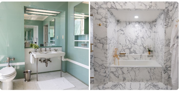 川普在Truth Social上接连发布了7个帖子,展示翻修前后的对比照片以及装修后浴室的细节。照片显示,该浴室原有的装饰艺术风格(Art Deco)淡绿色瓷砖已被彻底更换,取而代之的是铺满墙壁和地板的黑白抛光大理石。