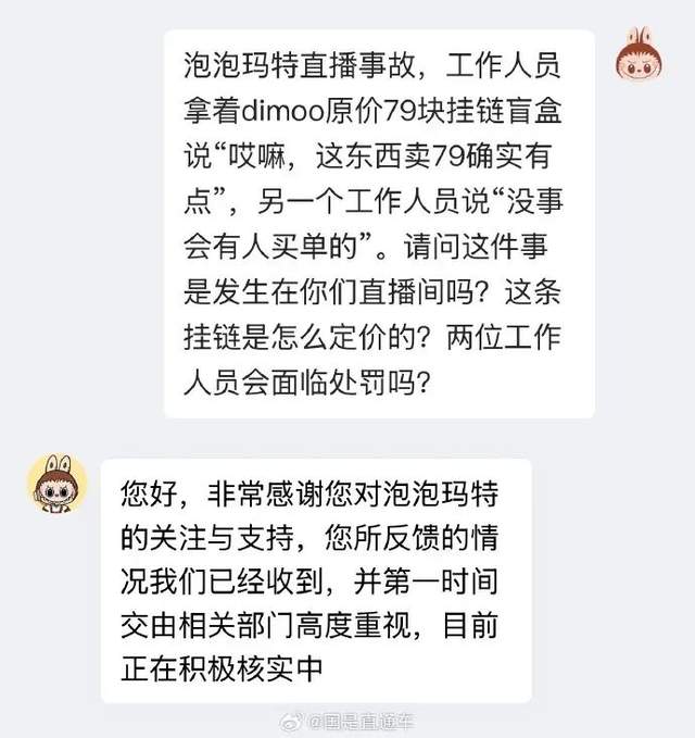 对此,记者问询涉事直播间。该直播间回应称:非常感谢您对泡泡玛特的关注与支持,您所反馈的情况我们已经收到,并第一时间交由相关部门高度重视,目前正在积极核实中。