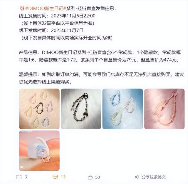 据悉,涉事产品系泡泡玛特11月新推出的“DIMOO新生日记系列-挂链盲盒”。据泡泡玛特介绍,该盲盒系列含6个常规款,1个隐藏款,常规款概率是1:6,隐藏款概率是1:72。该系列单个盲盒售价为¥79元,整盒售价为¥474元。