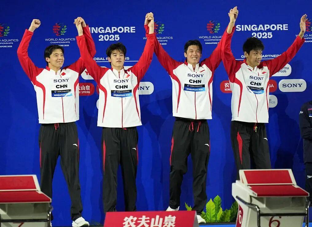 2025年8月1日,亚军由潘展乐、汪顺、张展硕、季新杰(从左至右)组成的中国队在比赛后。新华社记者夏一方摄