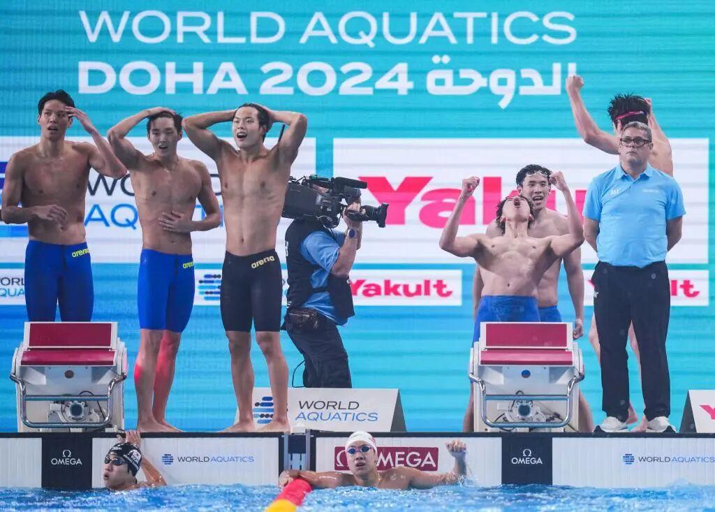 2024年2月16日,中国队选手王浩宇(右三)、季新杰(右四)、张展硕(右下)在比赛后庆祝。当日,在卡塔尔多哈举行的2024年世界游泳锦标赛游泳项目男子4X200米自由泳接力决赛中,由季新杰、王浩宇、潘展乐、张展硕组成的中国队以7分1秒84的成绩夺得金牌。新华社记者杜宇摄