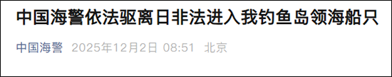 微信公众号“中国海警”消息,中国海警局新闻发言人刘德军表示,12月2日,日“瑞宝丸”号渔船非法进入我钓鱼岛领海,中国海警舰艇依法对其采取必要管控措施并警告驱离。钓鱼岛及其附属岛屿是中国固有领土,我们敦促日方立即停止在该海域的一切侵权挑衅活动。中国海警将持续在钓鱼岛海域开展维权执法活动,坚决维护国家领土主权和海洋权益。
