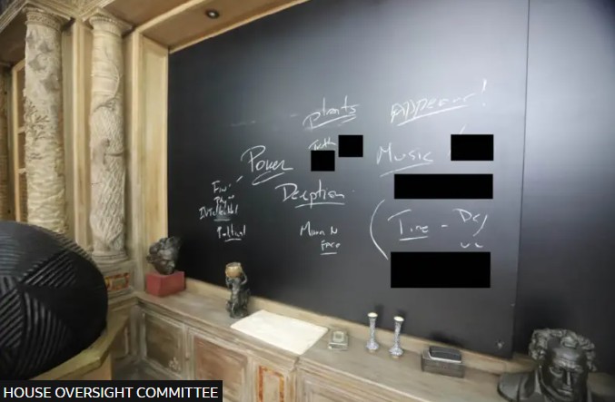 尤为引人注目的是一部固定电话,其快速拨号按钮上贴着几个名字,包括达伦、里奇、迈克等。另一张照片则捕捉到了书房里的一块黑板,上面潦草地写着权力、欺骗、阴谋和政治等词汇。