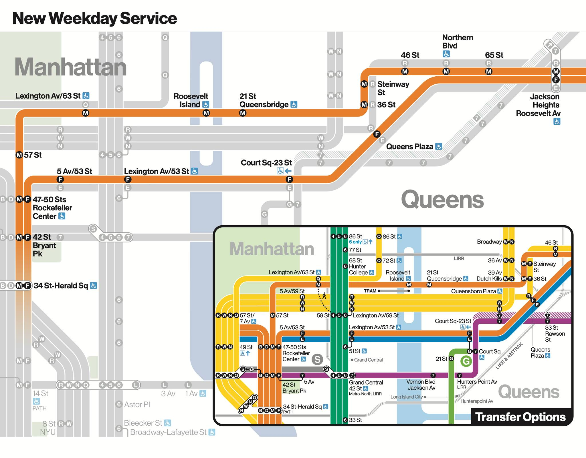根据新安排,工作日早上6:30至晚上9:30,F线与M线将永久交换在长岛市与曼哈顿之间使用的东河隧道。F线列车依旧在杰克逊高地—罗斯福大道以西的皇后大道下方快速运行,但不再进入63街隧道,而是改为在皇后广场站停靠后,通过目前由M线使用的53街隧道驶入曼哈顿。