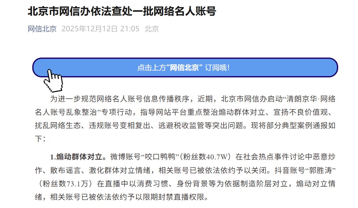 据网信北京12月12日消息,为进一步规范网络名人账号信息传播秩序,近期,北京市网信办启动“清朗京华·网络名人账号乱象整治”专项行动,指导网站平台重点整治煽动群体对立、宣扬不良价值观、扰乱网络生态、违规账号变相复出、逃避税收监管等突出问题。现将部分典型案例通报如下: