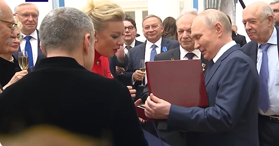 普京向扎哈罗娃颁发勋章时的画面图源:克里姆林宫网站