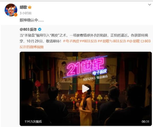 今年10月,“803反诈”发布主题微电影《21世纪电子画皮》的预告片,胡歌也在结尾惊喜出镜。他本人也发博宣传配文:眼神确认中……