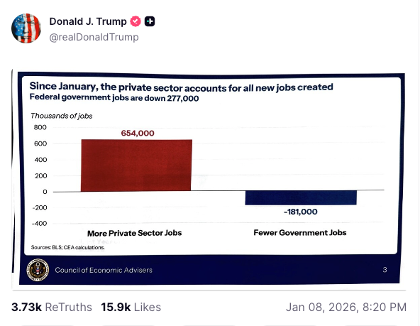川普周四晚间在其社交平台Truth Social上发布了一系列帖文,其中一篇帖子分享了一些信息图表,其中包含了应该在周五早间才正式发布的去年12月就业报告信息。