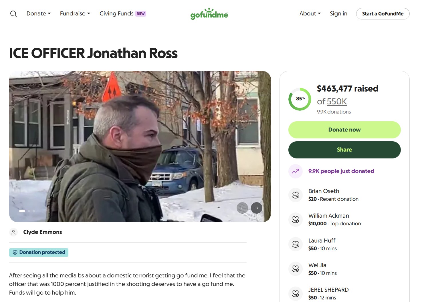 截至1月12日上午,这项由克莱德·埃蒙斯(Clyde Emmons)在GoFundMe上发起的活动已吸引了近1万人参与捐款,其中包括亿万富翁、对冲基金巨头阿克曼(Bill Ackman)捐赠的1万美元。