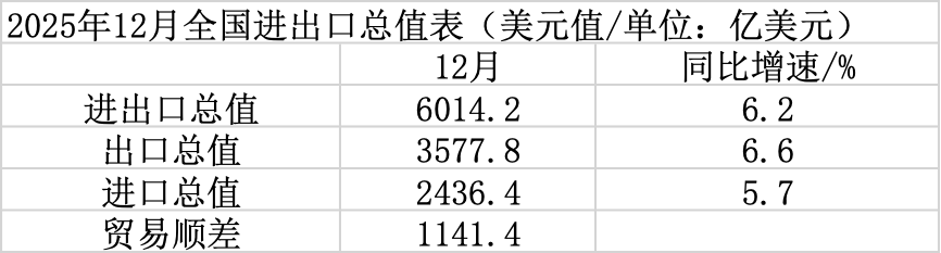 1月14日,中国2025年12月及全年外贸数据出炉。据海关总署,2025年12月,以美元计,中国进出口总值6014.2亿美元,同比增长6.2%。其中,出口3577.8亿美元,同比增长6.6%;进口2436.4亿美元,同比增长5.7%;贸易顺差1141.4亿美元。