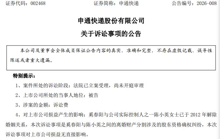 针对本次诉讼对公司的影响,申通快递表示,涉诉股份约占上市公司总股本的1.33%,该事项不会对公司正常生产经营、内部治理和规范运作产生重大不利影响,也不会改变公司的实际控制权。同时,公司指出,本次诉讼目前仅处于法院立案受理阶段,尚未开庭审理,亦未产生具有法律效力的判决或裁定,陈小英名下持有公司股份是否发生权益变动仍存在不确定性。