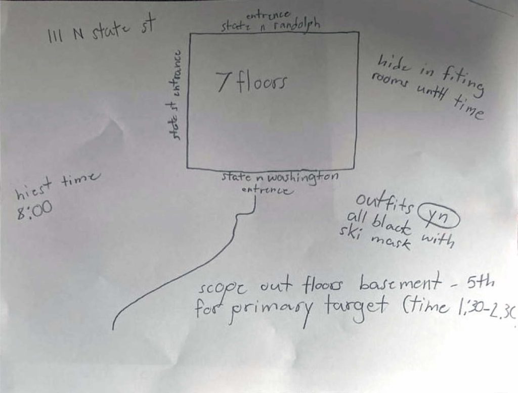 地图上还列出了分步战术指令,包括“躲在试衣间里直到时机成熟”“侦察地下室楼层——主要目标为5楼(时间1:30–2:30)”。两人甚至提前规划了作案穿着,备注将身着“全黑滑雪服”。