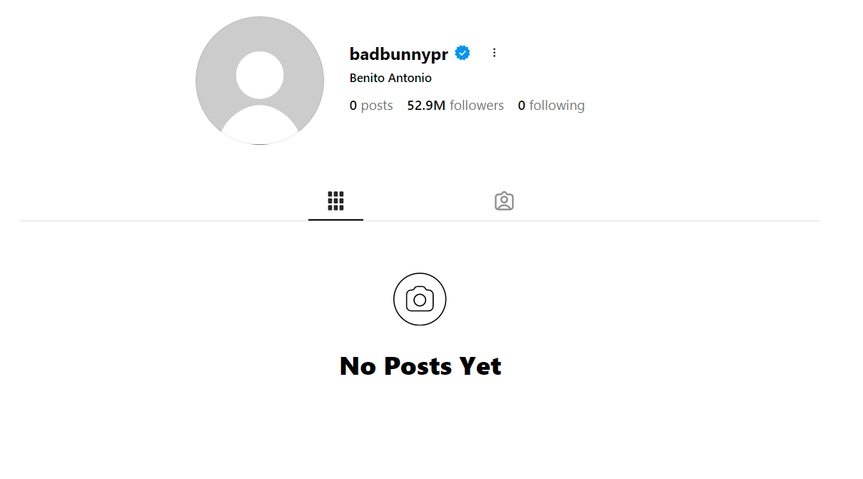 周一,Bad Bunny的Instagram账号已不再显示任何过往帖子。页面仅保留了其专辑《Debí Tirar Más Fotos》的链接,并显示“暂无帖子:badbunnypr发布帖子时,你将在此处看到他们的照片和视频”。与此同时,他还删除了个人头像,并显示未关注任何其他账号。