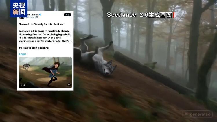 导演布雷特·斯图尔特发布了一段少年与小狗在树林追逐的15秒短片。他感叹道:“Seedance 2.0将彻底改变电影制作的未来。”