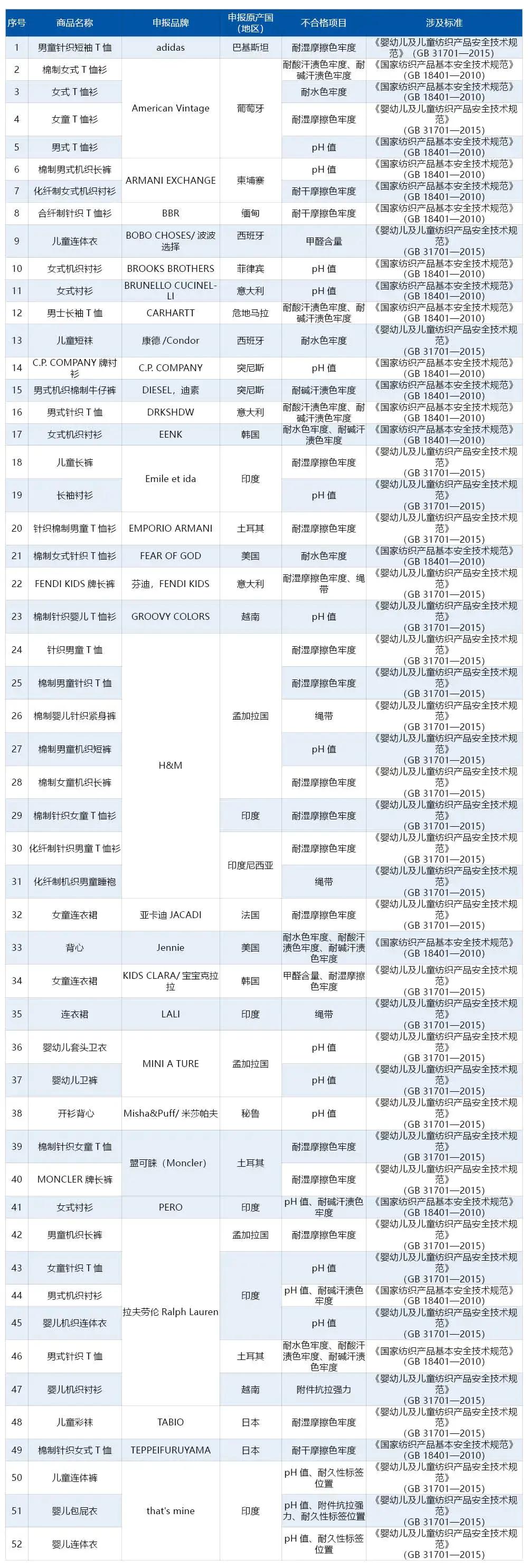 此次通报的典型案例涉及服装甲醛含量超标、pH值不合格,餐具、厨具等食品接触产品铅、铝、铬、钴、锰、镍等元素迁移量超标等情况。