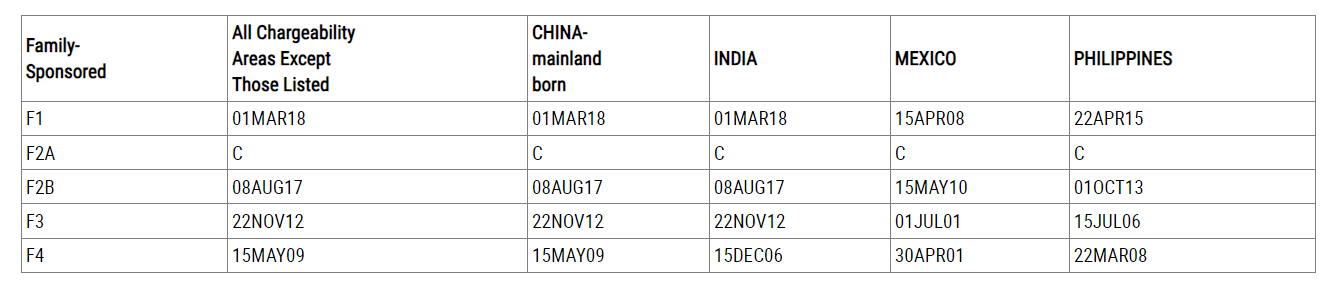 中国大陆出生亲属移民递件排期方面,F1类(公民的21岁以上未婚成年子女)前进182天,F2B(永久居民的21岁以上未婚成年子女)前进147天,F3类(公民的成年已婚子女)前进124天,F4类(公民的兄弟姊妹)前进76天,而F2A类(永久居民的配偶及未成年子女)相较上月无变化。