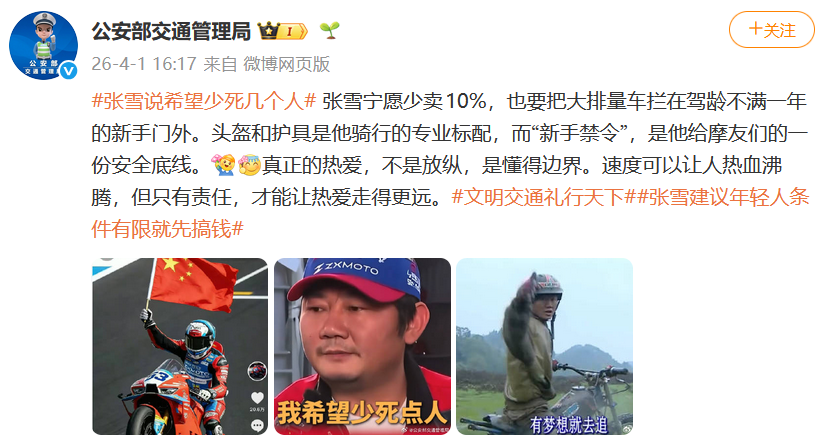 @公安部交通管理局 4月1日发文力挺张雪:“张雪宁愿少卖10%,也要把大排量车拦在驾龄不满一年的新手门外。头盔和护具是他骑行的专业标配,而‘新手禁令’,是他给摩友们的一份安全底线。真正的热爱,不是放纵,是懂得边界。速度可以让人热血沸腾,但只有责任,才能让热爱走得更远。”