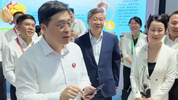 “给我爱人买的。” 当天在消博会广西馆,韦韬拿起壮锦包包现场观看。¥618元的壮锦包,商家打折后¥580元。韦韬笑着说,“你不要乱打折啊,要正常打折。”他拿出手机扫码支付,并向商家展示,“已经付款成功了啊”。