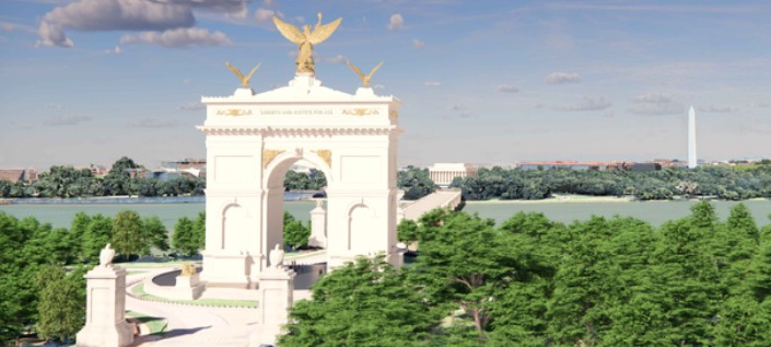 根据Harrison Design提交的效果图,这座拟建拱门在风格上与巴黎凯旋门颇为相似,但高度将比后者高出近100英尺。设计方案显示,拱门顶部将装饰两只展翅的雄鹰,以及一尊戴皇冠、带有双翼的人物镀金青铜雕像。拱门两侧分别刻有“上帝庇佑下的国度”和“人人享有自由与正义”的铭文,两侧还将安置金色的雄狮雕像。建成后,这座拱门将矗立于林肯纪念堂与阿灵顿国家公墓之间。