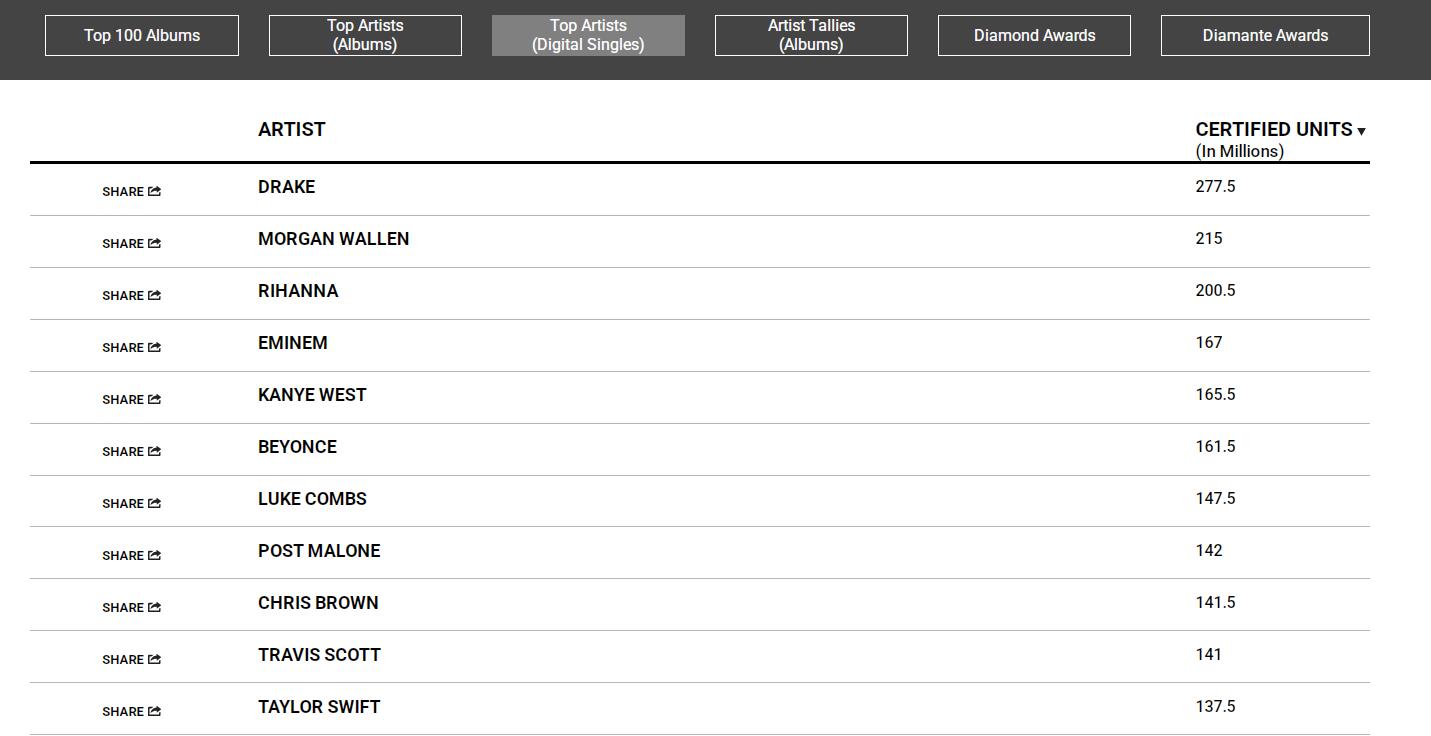 据《滚石》杂志报道,截至当地时间4月15日,蕾哈娜(Rihanna)成为首位美国唱片业协会(RIAA)认证的单曲销量突破2亿张的女歌手,位列榜单第三,仅次于德雷克(Drake)和摩根·沃伦(Morgan Wallen)。