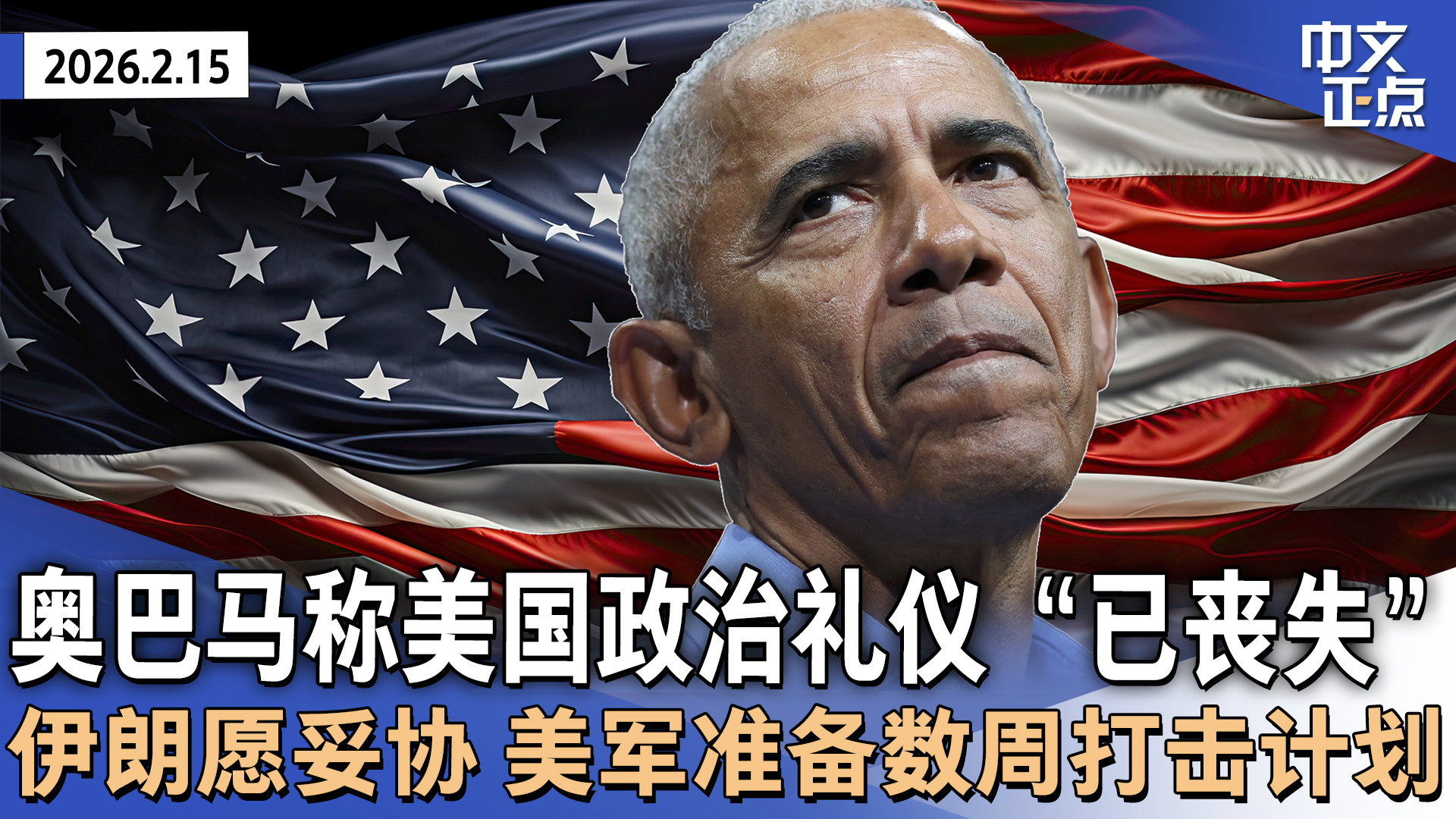 奥巴马首度回应“猿类视频”|司法部提交爱泼斯坦案“敏感人物名单”|川普将公布$50亿加沙援助承诺|伊朗愿妥协 美军准备数周打击计划|Seedance火出圈 字节跳动回应争议《中文正点》26.2.15